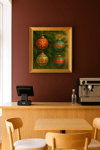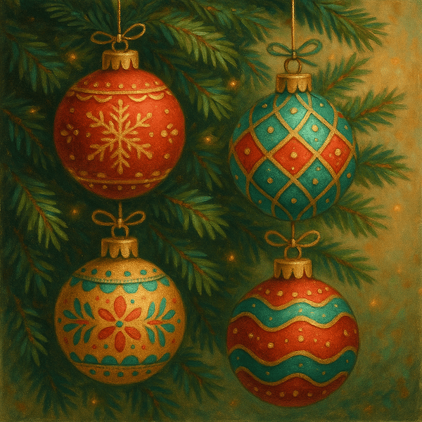 "Esferas navideñas" Arte digital, cuatro esferas navideñas que decoran un árbol de navidad, con colores tradicionales dorado, verde, y rojo, creando un ambiente cálido.