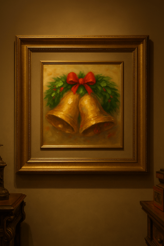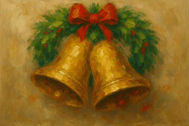 "Campanas de Navidad" Arte digital, composición cálida y festiva. Óleo decorativo de campanas doradas y una corona verde que se forman con pinceladas gruesas y expresivas, con detalles en rojo intenso, fondo neutro con textura de óleo.