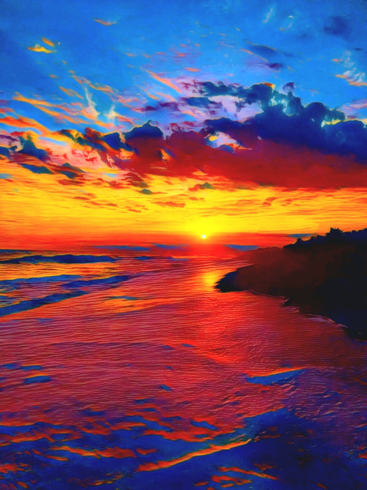 Sumérgete en la intensidad de este arte digital que retrata un atardecer único en la playa. El cielo se tiñe de rojos ardientes y amarillos brillantes, mientras el mar refleja profundos tonos azul y rojo. ¡Una pieza vibrante y emocional, ideal para quienes buscan llevar a su espacio una mezcla de fuerza, belleza y contemplación. Perfecta para decorar con carácter y profundidad.