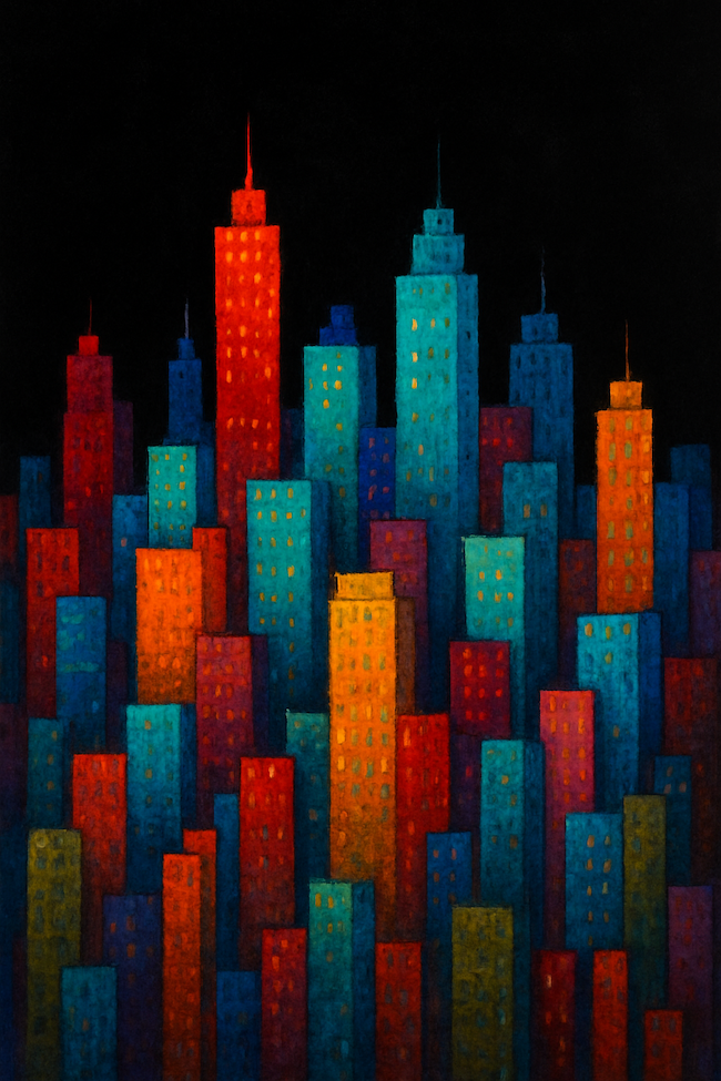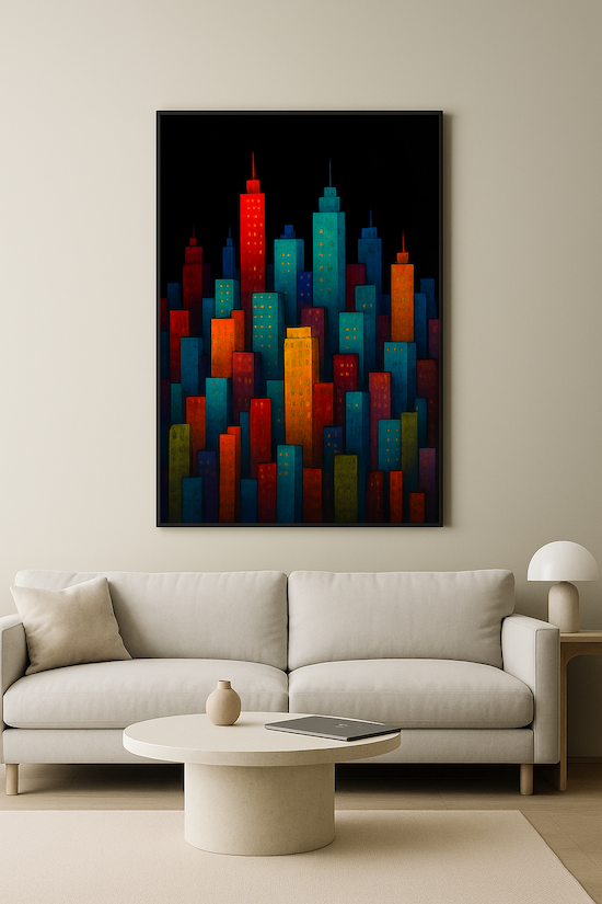 "Ciudad abstracta" es una obra en técnica óleo digital, que representa la energía vibrante de una metrópoli moderna. Cada edificio se eleva con un color único, logrando una paleta armónica y equilibrada que contrasta con el fondo negro profundo, transmitiendo fuerza, movimiento y modernidad. Perfecta para quienes buscan una pieza contemporánea llena de carácter.